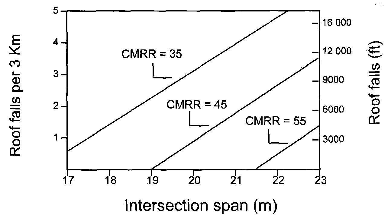 Figure A2 - Relationship between CMRR, intersection span, and the incidence of roof falls observed at 6 U.S. mines.